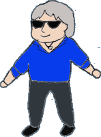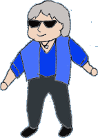 濃いブルーのシャツの上に、濃いブルーのベストを着ていました。