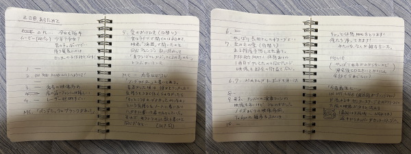今回は2daysあったので、2日間の記憶が混ざらないように初日の夜に下書きをしました。