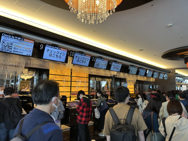 広いロビーは人でいっぱい。チェックインにも、ものすごい長蛇の列ができていました。