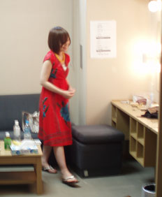 前奏の間に、ステージソデから投じ様した川嶋あいの衣装は、大きな紺色の模様の入った赤いワンピース。