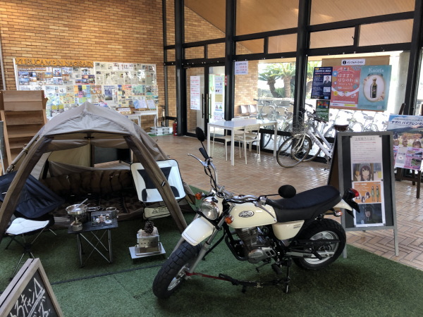 管理棟に入ると、テントが設営されていて、『ゆるキャン△』のキャラのアヤちゃんのバイクがありました。