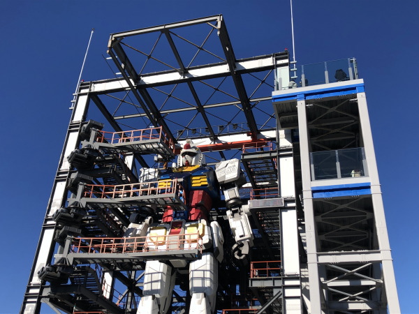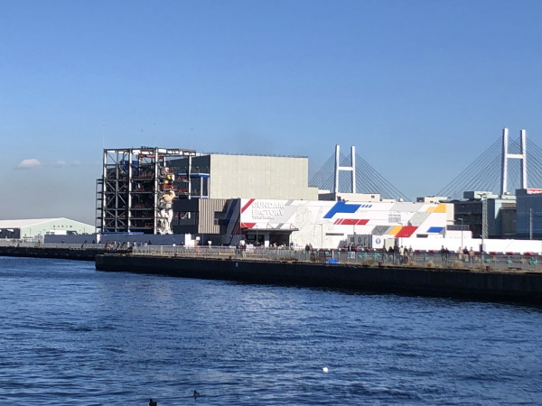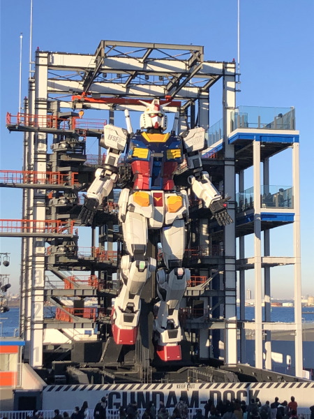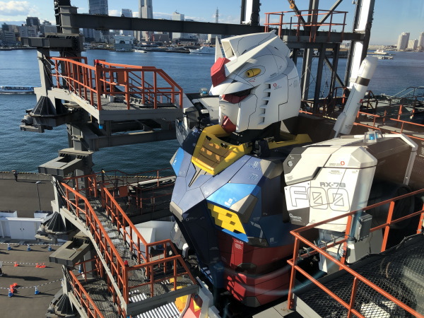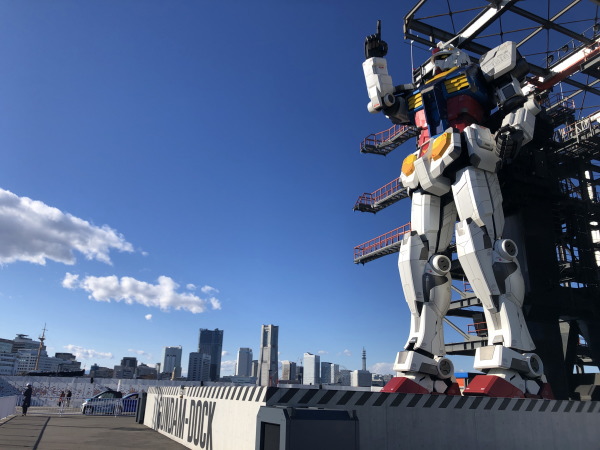 横浜湾をバックに、ガンダムの白い巨体が映えます。
